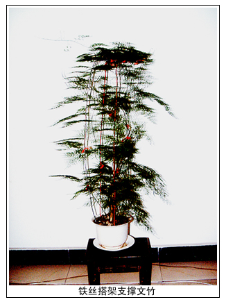 文竹改进的办法是,用铁丝扎成简单笼式的架子,其高度在80厘米左右为宜,插于花盆四周,然后把嫩枝向架上牵引,均匀分布固定即可。为提高绿化效果,可选用大文竹品种,分3丛至4丛以三角形或四边形而种植。这样文竹的丛径可达30厘米至50厘米,高可达一米多,从而改变了文竹弱小的形象。