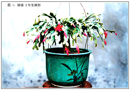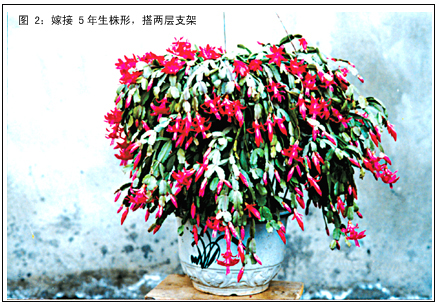 嫁接仙人指多数都是一掌一层,设圆架支扶(如图1)。当仙人指生长三四年后,自然形成茎节多而长,稠密深厚,不通风透光。这会使其光合作用受影响,出现茎节软薄或脱落,不孕蕾开花等弊病。为解决这一弊端,大都采取摘除内膛过密茎节的办法。笔者近两年通过摸索,采取用长茎节分层整理往上再攀一层,形成两个层次的方法,达到了花形丰满、枝繁花茂的效果(如图2)。具体做法如下: