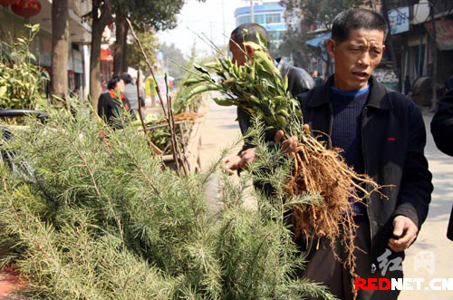 1月27日,湖南省邵阳县谷洲镇农民在市场选购果树苗。当日,是新年首个赶集日,前来购买桔、梨、桃等果树苗的人群络绎不绝,苗木市场一派繁忙景象,苗木交易红火。