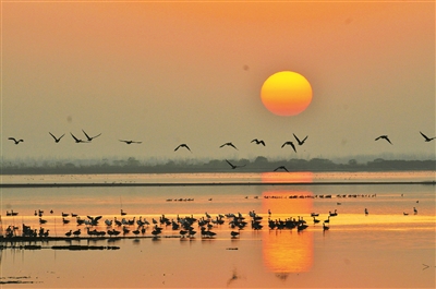 夕阳下的武汉沉湖湿地候鸟翩飞。周卫平摄