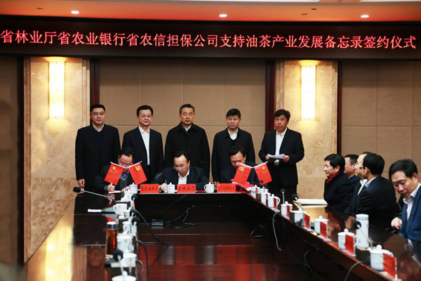 2016年1月27日上午,在全省林业工作座谈会暨林业局长会议在长沙召开之前,省林业厅、省农业银行、省农业担保公司签署了支持油茶产业发展综合金融服务合作备忘录。农行衡阳市、永州市分行与湖南中联天地油茶开发有限公司、湖南天沃科技有限责任公司合作签约仪式同期举行。省人民政府副省长戴道晋、省人民政府副秘书长曹英华,省林业厅厅长邓三龙、厅副厅长胡长清、柏方敏,省农行行长张晓男、省农业信用担保公司董事长易跃进出席签约仪式。省林业厅办公室、油茶办有关负责人,省农行、省农业担保公司有关部门经理,各市州林业局局长等参加了签约仪式。