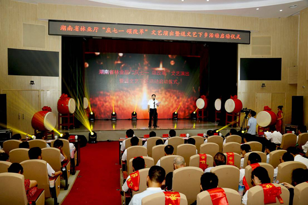 演出前,胡长清厅长发表了热情洋溢的讲话并为“湖南林业”艺术团授旗。他指出,为繁荣和推广林业行业文化,丰富林区群众和基层林业干部职工的精神生活,自2011年起,湖南省林业厅已经连续开展了三届送文艺下乡活动,先后送去了18场高质量、高水准的演出,覆盖了永州、怀化、湘西州、娄底等地的数十个国有林场、森林公园、自然保护区,扶贫点等地。他要求艺术团通过歌、舞等节目,送出文化的魅力、送出精神的力量,颂出改革的磅礴之力,把厅党组的关怀和温暖带到“林家铺子”每个人的心中,增强林区群众的幸福感和自豪感。