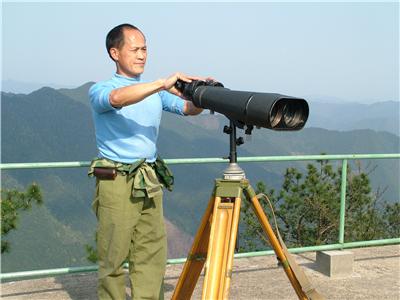 在瞭望台上用高倍望远镜观测火情是余锦柱的日常工作
