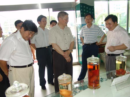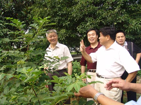 10日上午,在州委副书记王承荣、州委常委、吉首市委书记徐克勤和有关县、市责人的陪同下,葛汉栋厅长考察了前不久刚刚获得全国经济林产业化龙头企业称号的湘泉制药和湖南老爹公司。在湘泉制药公司,葛厅长一边参观药材示范园,一边听取公司董事长王锡炳介绍公司情况,当在陈列室看到湘泉制药公司获得的全国经济林产业化龙头企业奖牌时,葛厅长非常高兴,和王锡炳董事长抱牌合影。在湖南老爹公司,公司董事长田儒斌利用多媒体介绍了公司情况,当得知湘西州很多农民利用退耕地种植猕猴桃走上致富之路时,葛厅长十分高兴,当即批示:州、县林业部门要提供优惠政策,大力支持林业产业化龙头企业发展。并表示,今年国家下达给湖南省的10万亩退耕地造林计划将全额下达给自治州。下午,葛厅长一行离开吉首去张家界途中,考察了吉首市桤木速生林基地和永顺退耕地猕猴桃基地。临别时,厅长说:“这次来湘西,我是120分的满意,给你们多加了20分。”