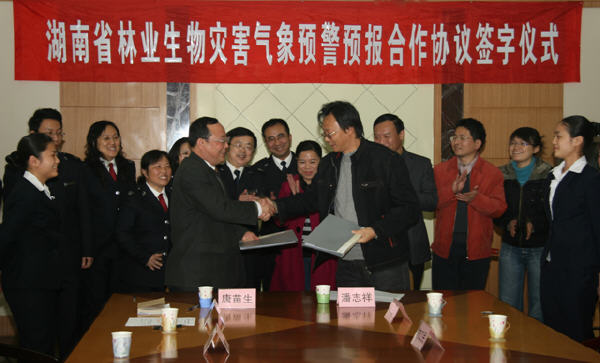2008年12月5日湖南省林业厅、湖南省气象局联合开展林业生物灾害气象预警预报合作协议签字仪式在湖南省林业厅举行。湖南省气象局潘志祥副局长、省林业厅唐苗生副厅长、省气象局减灾处、气候中心、省森防总站相关人员参加了签字仪式。