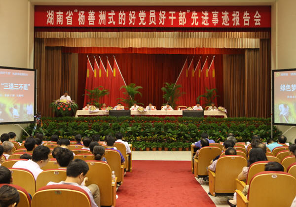6月14日上午,由中共湖南省委组织部、中共湖南省委宣传部、中共湖南省委创先争优办公室主办,湖南省林业厅、湖南省扶贫办协办的湖南省“杨善洲式的好党员好干部”先进事迹报告会在省委机关礼堂举行。省委常委、省委组织部部长黄建国出席报告会并作重要讲话。省委宣传部部长路建平主持。省委组织部副部长、省委创先争优活动领导小组办公室主任郭树人、省委宣传部副部长张志初出席报告会。省林业厅副厅长胡长清率厅办公室、机关党委、监察室、人教处、计财处、造林处、森林公安局、老干处、宣传中心相关负责人参加。