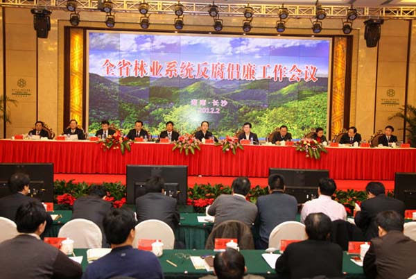 2月17日下午,全省林业系统反腐倡廉工作会议在长沙召开。会议传达贯彻中纪委第七次全会和省纪委第二次全会精神,认真总结了2011年反腐倡廉工作,科学分析了当前林业系统反腐倡廉形势,表彰了2011年度全省林业行风建设先进单位,全面部署了2012年林业反腐倡廉工作。省委常委、省纪委书记黄建国出席会议并作重要讲话。厅党组书记、厅长邓三龙作工作报告。厅党组副书记、副厅长胡长清副主持会议。厅党组成员、纪检组长王鹰柏宣读《湖南省林业厅关于表彰2011年度全省林业行风建设先进单位的通报》。厅领导唐苗生、柏方敏、文振军、李益荣、柳开明、吴剑波,副厅级干部姚先铭等出席会议并在主席台就座。
