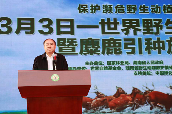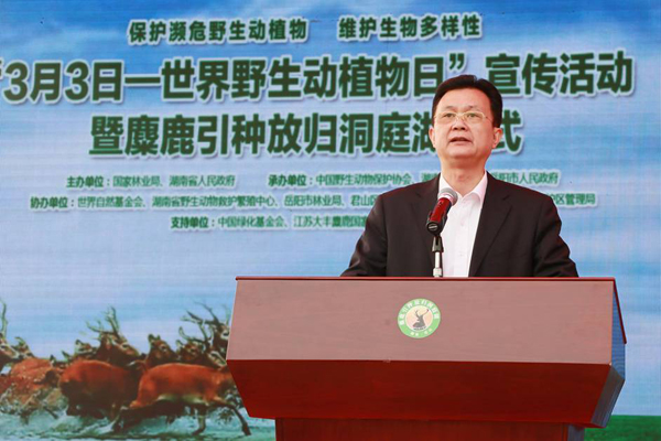 3月3日,由国家林业局、湖南省人民政府主办的2016年“3月3日—世界野生动植物日”宣传活动暨麋鹿引种放归洞庭湖仪式在湖南东洞庭湖国家级自然保护区举行。国家林业局副局长陈凤学发表重要讲话。湖南省人民政府副省长李友志宣布麋鹿引种放归洞庭湖仪式开始。省林业厅党组书记、厅长邓三龙致欢迎辞。国家林业局野生动植物保护与自然保护区管理司司长张希武主持仪式。岳阳市委副书记、市长刘和生代表市政府接受认领麋鹿企业捐赠,并给企业代表移交麋鹿档案资料。