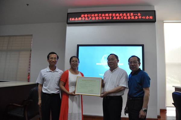 6月6日下午,湖南天华油茶科技股份有限公司经理王丛亚在省林业厅政务服务中心从厅巡视员唐苗生手中接过省林业厅核发的首本 “两证合一”的《林木种子生产经营许可证》,标志着我省新版林木种子生产经营许可制度正式施行。