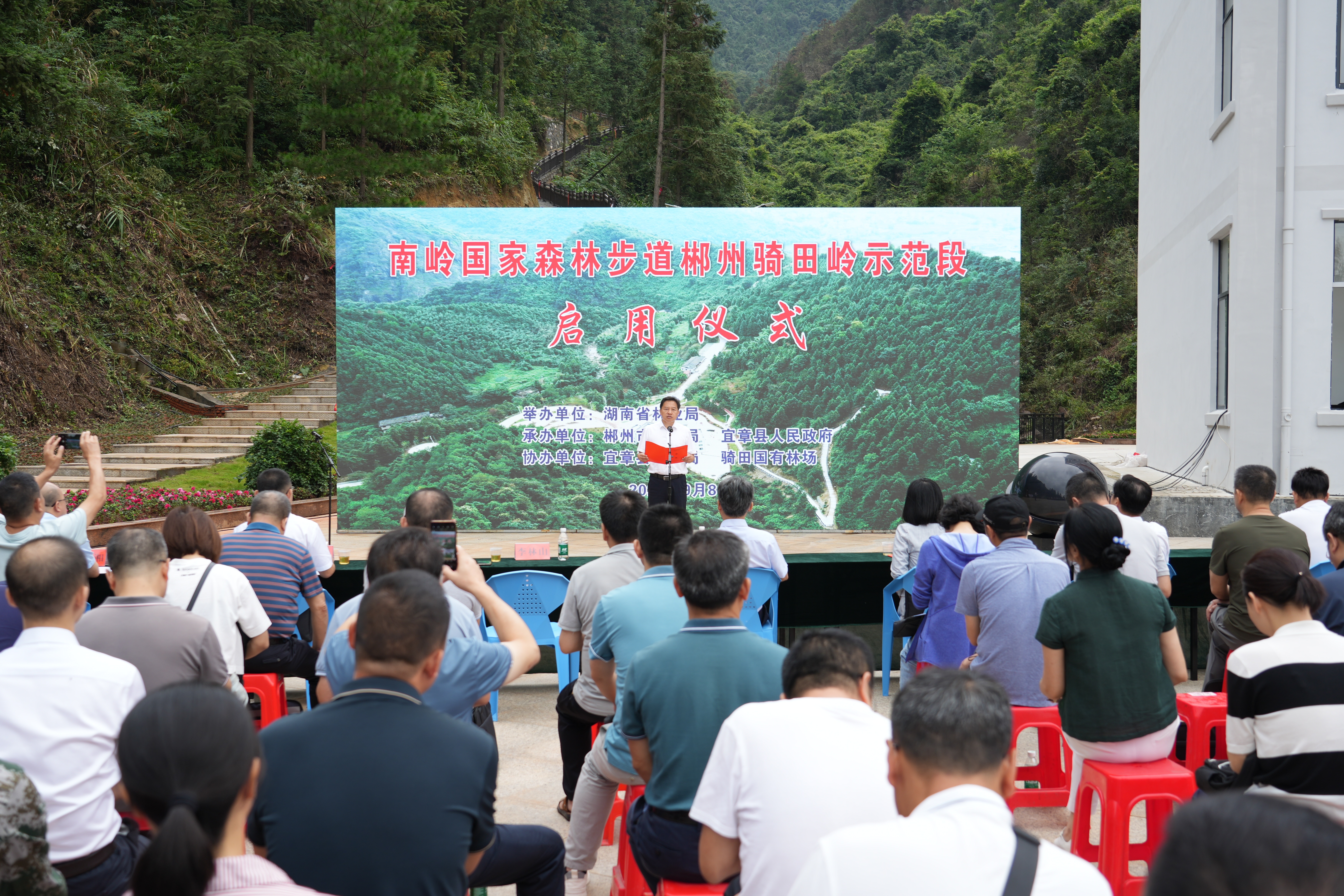 五岭逶迤藏秀色,骑田岭上好风光。9月8日,南岭国家森林步道郴州骑田岭示范段启用仪式在宜章骑田国有林场举行。国家林草局国有林场和种苗管理司二级巡视员李焰,省林业局党组成员、副局长李林山,以及郴州市、宜章县政府和各市州林业局相关负责人、嘉宾等出席启用仪式。