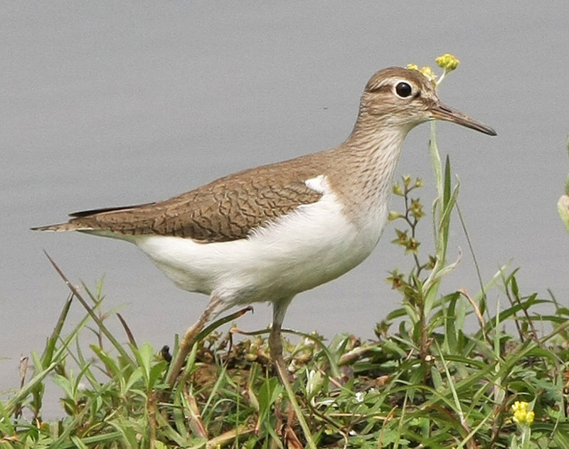 矶鹬 Actitis hypoleucos 是鹬科鹬属的鸟类,上体褐色,飞羽近黑,具有白眼圈,眉纹白色;下体白色,上胸有细的黑色纵斑。翼角前方有由胸腹部延伸的白色横斑。飞行时具有明显的折色翼带。外侧尾羽白色,上有黑斑。栖息于沿海滩涂、沙洲以及海拔比较高的山地稻田及溪流、河流两岸,喜欢沿水边跑跑停停,行走时头不停的点动,停息时尾羽不停的上下摆动。喜欢吃昆虫、螺类、蠕虫。繁殖5~7月,营巢于河边沙滩草丛中地上,每窝产卵4~5枚。