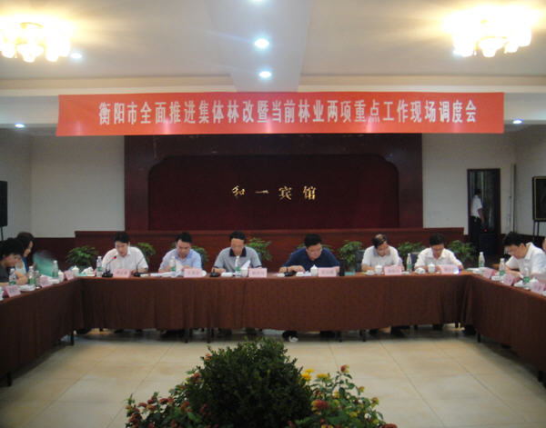 7月10日,衡阳市全面推进集体林改暨林业两项重点工作(“三边”造林、油茶产业化建设)现场调度会在常宁市和一宾馆召开。出席了会议的主要领导有市委副书记、市长张自银、市委常委、市委秘书长杨邦伟、副市长蒋勋功。参加会议的有各县市区长、分管副县市区长、林业局长;市农办、市编办、市财政局、市人事局、市劳动和社会保障局、市林业局等单位主要负责人。