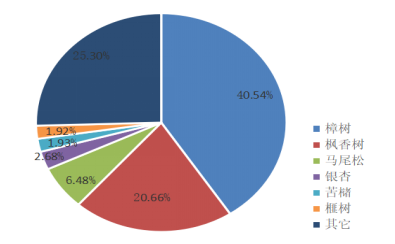 二是种类相对集中。长沙古树名木以乡土树种为主,株数排名前三树种分别为樟树2449株、枫香树1248株、马尾松391株,分别占全市古树名木总数40.54%、20.66%、6.48%,三者累计占全市古树名木总株数的67.68%。(详见图2)