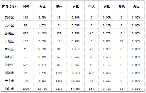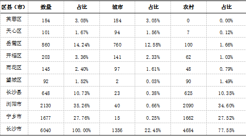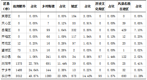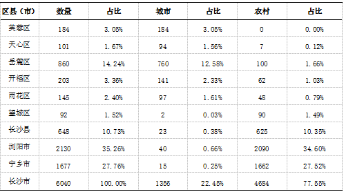 三是分布相对散落。长沙市各个行政区及乡镇均有古树名木分布,从大范围来看呈块状分布,从小范围看成聚集分布。按分布特点划分,长沙市散生的古树名木4884株,占80.86%;群状的古树名木1156株,占19.14%。按分布区域划分,其中位于城市的有1356株,占22.45%;位于农村的有4684株,占77.55%,绝大部分位于农村,生长场所大多位于远郊野外(详见表4)。按行政区域划分,分布数量前三名分别为浏阳市2130株、宁乡市1677株、岳麓区860株,其中浏阳市是同时为一级、二级、三级古树分布最多的区域。长沙市内六区中岳麓区一级、二级、三级古树分布最多。在名木的分布上,长沙县为整个长沙市名木数量分布最多的区域,拥有192株、占全市名木数量的94.58%(详见表3)。按照权属特征划分,长沙市古树名木大部分为集体所有,国有的古树名木1979株,占32.76%,集体所有的古树名木3478株,占57.58%,个人的古树551株,占9.12%,其他32株,占0.53%。权属为国有的古树名木除雨花区外主要位于长沙内五区,权属为集体所有的古树名木主要位于浏阳市及宁乡市。(详见表5、表6)