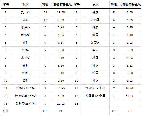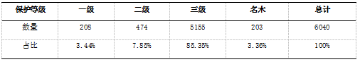 一是资源总量充足。根据国家城建部出台的《城市古树名木保护办法》规定,古树是指树龄在100年以上的树木,名木是指在历史上或社会上有重大影响的中外历代名人、领袖人物所植或具备极其重要的历史、文化价值的树木。据统计,长沙市共有古树名木6040株,分属48科87属129种。(详见表1)其中,树龄在500年以上一级古树208株,树龄300~499年二级古树474株,树龄100~299年三级古树5155株,名木203株。(详见图1、表2)