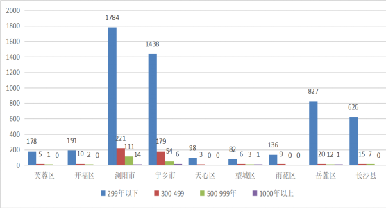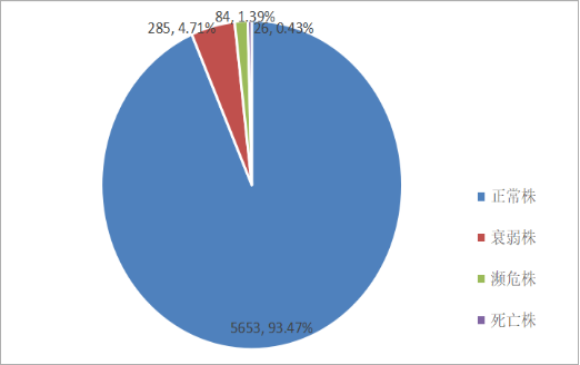 四是生长势不理想。古树名木树龄相对较小,千年以上古树仅有22棵,集中分布在浏阳市、宁乡市、望城区、岳麓区四个区域;低龄古树比重较大,全市各区树龄在299年以下的古树名木占88.82%,占据了绝大多数,后备资源较为丰富。古树名木生长势一般,衰弱株、濒危株以及死亡株共395株,占全市古树名木6.53%,较多古树遭受过灾害侵扰,处于生长环境差的古树数量有958株,占15.86%。(详见图3)