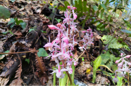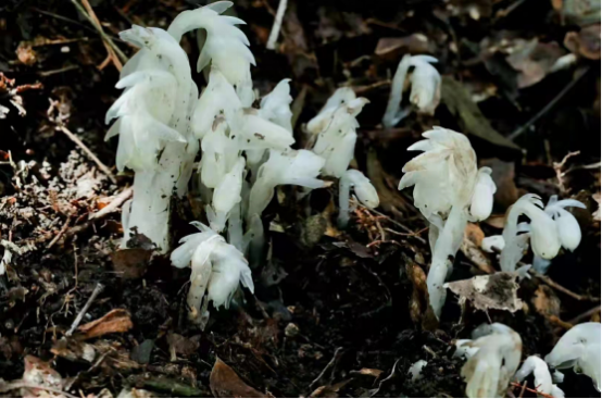 在一处幽暗潮湿的腐叶层上,簇拥生长一种通体洁白如玉的奇特植物,其花筒似烟斗,花朵微下垂,在幽暗处散发出诱人的白色亮光,耀眼夺目。经专家鉴定,这种奇特的植物为有着“花中玉女”之美誉的水晶兰。据资料记载,水晶兰非兰科、蕈类,属鹿蹄草科植物,这种植物非常罕见,它没有叶绿素,不能进行光合作用,仅靠腐烂的植物吸取养分,故又别称“冥界之花”“幽灵之花”。水晶兰对生存环境要求极为苛刻,常生长于海拔800米~3000米阴凉潮湿的针、阔叶混交林间,依靠特殊菌体方能生存,其种子异常微小,在人工条件下难以萌芽。而在另一处腐叶层上,生长着15株鲜花盛放的奇特植物,其花呈下垂状,花色呈白色略带粉红色,花间距松散。经专家鉴定,这种奇特的植物为有着“兰中西施”之美誉的翘距虾脊兰。据资料记载,翘距虾脊兰属兰科虾脊兰属,为半阴生植物,常生长于海拔1000米以上的山地沟谷阴湿处和密林下,喜温暖和湿润环境。