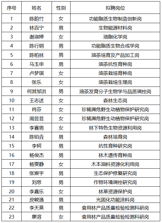 根据《湖南省林业科学院2025年高层次人才公开招聘公告》要求,通过发布公告、现场报名、资格审查、考核、体检、考察等程序,经院党委会研究同意,确定陈韵竹等23名同志为我院拟聘用人选,现予以公示。